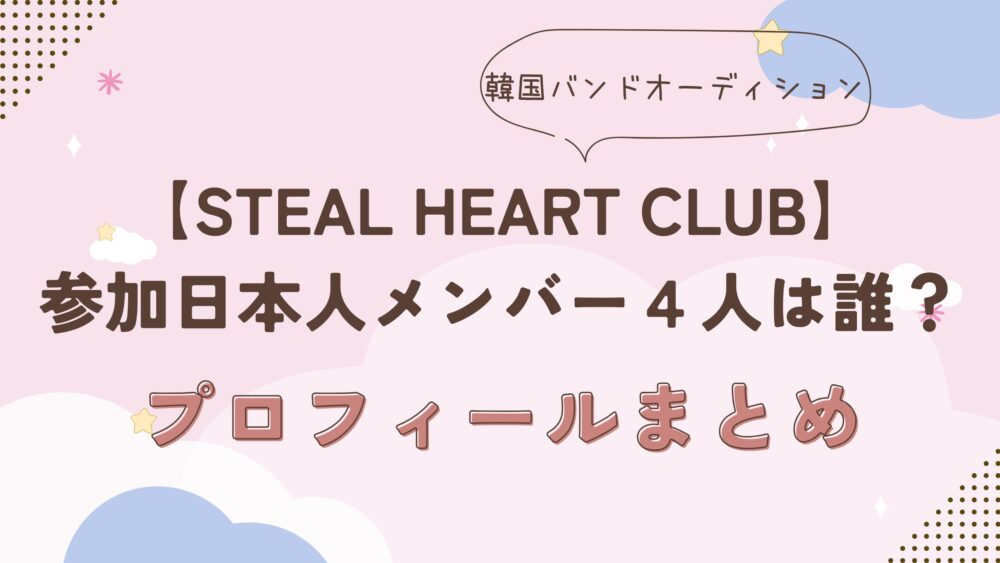 Mnetの新バンドサバイバル番組 「STEAL HEART CLUB(スチールハートクラブ、通称スハクル)」 がついにスタート。 実力者が集まる中、日本人から参加したメンバーは ケイテン/カズキ/ハギワ/マーシャの4名。 韓国のオーディション番組ですが、日本人4... オーディション