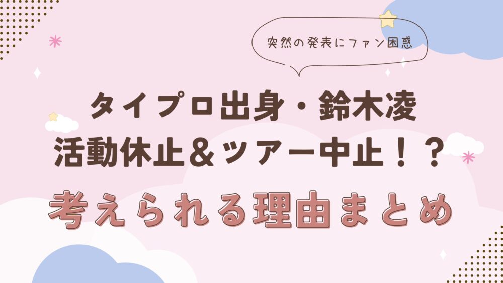 タイプロ出身のアーティスト・鈴木凌が、「ソロアーティスト活動の一時休止」と来月開催予定だったツアーの中止を突如発表し、ファンの間で大きな波紋が広がっています。 あまりに突然の発表に、SNSでは驚きと困惑の声が相次いでいます。本記事では、この... 未分類